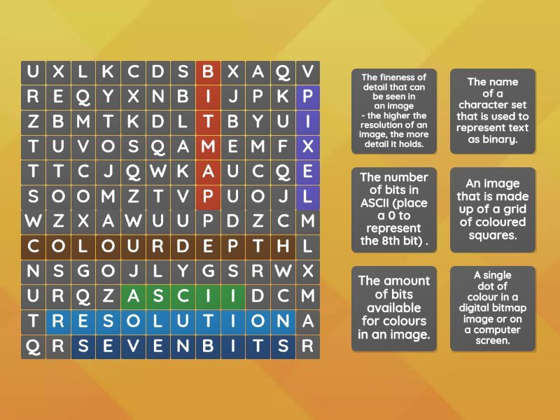 ASCII - The name of a character set that is used to represent text as binary., Pixel - A single dot of colour in a digital bitmap image or on a computer screen., Bitmap - An image that is made up of a grid of coloured squares., Resolution - The fineness of detail that can be seen in an image - the higher the resolution of an image, the more detail it holds., Colour depth - The amount of bits available for colours in an image., Seven bits - The number of bits in ASCII (place a 0 to represent the 8th bit) .,