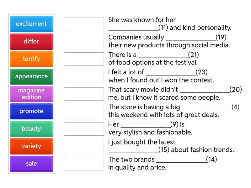 try on clothes - I want to _______________(1) before I decide which ones to buy., go window-shopping - Sometimes I _______________(2) just to see what’s new in the stores., wish list - I will add the new video game to ___________(3) for my birthday., get a discount - If you have a coupon, you can _______________(3) on your next purchase., sale - The store is having a big _______________(4) this weekend with lots of great deals., offer a discount - They often _______________(5) if you buy more than one item., have a refund - If the shoes don’t fit, can I _______________(6)?, stains on clothes - There are some _______________(7) that are hard to remove., stalls - The market has many _______________(8) selling fresh fruits and vegetables., appearance - Her _______________(9) is very stylish and fashionable., disappear - After a few minutes, the pain started to _______________(10)., beauty - She was known for her _______________(11) and kind personality., colourful - The garden has many _______________(12) flowers blooming in the spring., comparison - It’s helpful to make a _______________(13) between different products before buying., differ - The two brands _______________(14) in quality and price., magazine edition - I just bought the latest _______________(15) about fashion trends., edited picture - Most advertisements use an _______________(16) to make the product look better., exhaustion - After our long hike, I felt a deep _______________(17) in my legs., likeable - The main character in the movie is very _______________(18) and funny., promote - Companies usually _______________(19) their new products through social media., terrify - That scary movie didn’t _______________(20) me, but I know it scared some people., variety - There is a _______________(21) of food options at the festival., various - The shop sells _______________(22) types of clothing for men and women., excitement - I felt a lot of _______________(23) when I found out I won the contest., development - The _______________(24) of new technology makes life easier.,