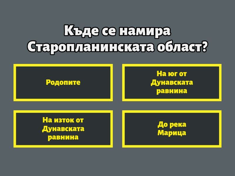 1) Къде се намира Старопланинската област? a) Родопите b) На юг от Дунавската равнина c) На изток от Дунавската равнина d) До река Марица 2) Кои части обхваща Старопланинската област? a) Предбалкан и Стара планина b) Дунавска равнина и Родопи c) Пирин и Рила d) Стара планина и Средногорие 3) Какво е пролом? a) Място, където реката пресича планината b) Висок връх c) Вид пещера d) Дълбока долина 4) Кои са някои от известните пещери в областта? a) Леденика и Бачо Киро b) Орлова чука и Ухловица c) Леденика и Дяволското гърло d) Магура и Проходна 5) Къде има лечебни минерални извори? a) Троян и Елена b) Габрово и Ловеч c) Шипково и Вонеща вода d) Вършец и Ловеч 6) На кои части се дели Стара планина? a) Източна, Средна и Южна b) Западна, Средна и Източна c) Висока и ниска d) Голяма и малка 7) Кое е старото име на Стара планина? a) Пирин b) Родопа c) Рила d) Хемус 8) Кой е най-високият връх в Стара планина? a) Ботев b) Вихрен c) Черни връх d) Мусала 9) Коя река се влива в Черно море? a) Осъм b) Камчия c) Вит d) Тунджа 10) Кой е най-големият национален парк в Старопланинската област? a) "Рила" b) "Пирин" c) "Централен Балкан" d) "Сините камъни"