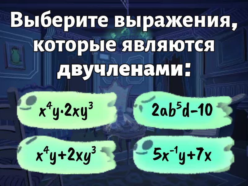 1) Выберите выражения, которые являются двучленами: a) x4y·2xy3 b) x4y+2xy3 c) 2ab5d-10 d) 5x-1y+7x 2) Выберите многочлен, который записан в стандартном виде: a) 8x4y+7x4y-3yx4 b) 6x2y-7x+y c) (x+5y3b)2 d) 5x4y3·xy2+x 3) Выберите многочлен, который имеет наибольшую степень: a) 5x2y-2x+y b) -6x5yc2+2x2c-2 c) 10x3y4-19xy+1 4) Выберите многочлен, который получится после приведения подобных слагаемых в многочлене 5a2b+4ab2-ab2+7a2b: a) 15a2b b) 15a3b3 c) 9a2b-6ab2 d) 4a2b+11ab2 e) 12a2b+3ab2
