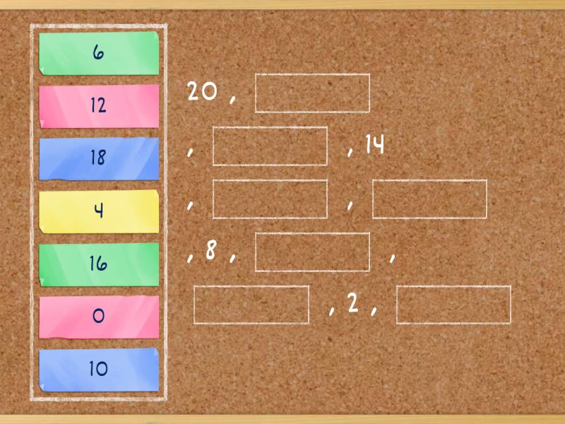 20 , ____ , ____ , 14 , ____ , ____ , 8 , ____ , ____ , 2 , ____