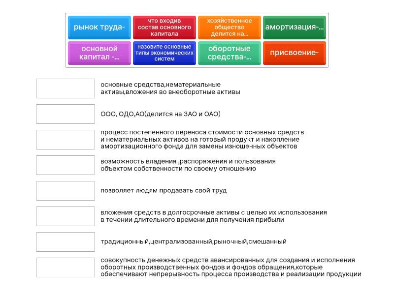 микроэкономика-... - раздел экономической науки , изучающий вопросы на уровне человека,семьи,предприятия, рынок труда- - позволяет людям продавать свой труд , спрос-... - желание и возможность потребителя приобрести товар или услугу в определенном месте в определенное время , собственность - - объективно возникающая и юридически закрепляемая совокупность взаимных отношений людей по присвоению богатства в процессе создания , распределения , обмена и потребления жизненных благ , присвоение- - возможность владения ,распоряжения и пользования объектом собственности по своему отношению , государственная собственность- - является достоянием всех людей данной страны.Управлением и распоряжением объектами собственности здесь занимаются органы государственной власти , коллективная форма собственности-... - объединение собственных средств нескольких участников , ради совместного владения фирмой , смешанная форма-... - когда участники поставлены в разные условия .Главные участники руководят фирмой и отвечают своим имуществом по обязательствам фирмы, хозяйственное общество делится на... - ООО, ОДО,АО(делится на ЗАО и ОАО), экономическая система - - способ согласованной деятельности производителей в условиях разделения труда, назовите основные типы экономических систем - традиционный,централизованный,рыночный,смешанный, основной капитал -... - вложения средств в долгосрочные активы с целью их использования в течении длительного времени для получения прибыли, что входив состав основного капитала - основные средства,нематериальные активы,вложения во внеоборотные активы, амортизация-... - процесс постепенного переноса стоимости основных средств и нематериальных активов на готовый продукт и накопление амортизационного фонда для замены изношенных объектов , оборотные средства-... - совокупность денежных средств авансированных для создания и исполнения оборотных производственных фондов и фондов обращения,которые обеспечивают непрерывность процесса производства и реализации продукции ,