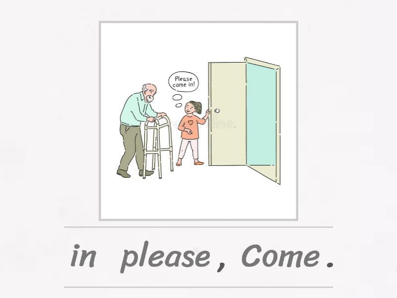 Come in, please., Sit down, please., Stand up, please., Open the door, please., Close the window, please., Clean the whiteboard, please., Look at the blackboard, please., Point to the whiteboard, please.,