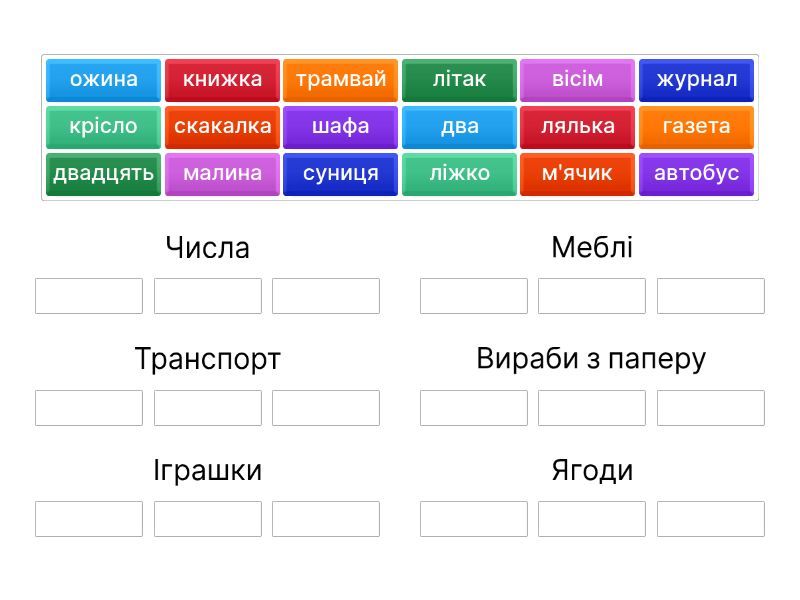 Числа: два, вісім, двадцять, Меблі: ліжко, шафа, крісло, Транспорт: автобус, трамвай, літак, Вираби з паперу: газета, журнал, книжка, Іграшки: лялька, м'ячик, скакалка, Ягоди: ожина, малина, суниця,