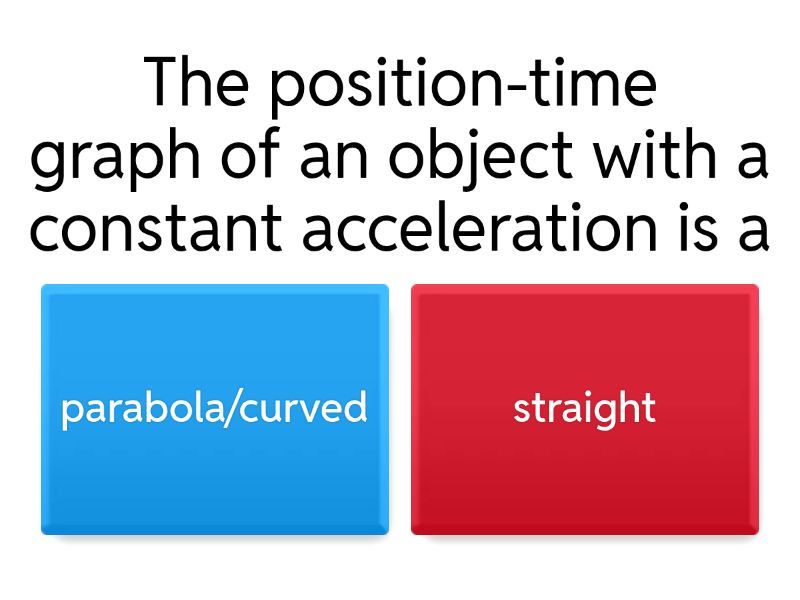 1) The position-time graph of an object with a constant acceleration is a a) parabola/curved b) straight 2) The velocity-time graph of an object with constant acceleration is a a) parabola/curved b) straight 3) In the velocity-time graph, the displacement of the object is the a) area above the graph b) area under the graph 4) The formula for the final velocity with average acceleration is a) vf= vi + a (tf-ti) b) vf= a- vit 5) An object has a constant acceleration has a) zero velocity b) changing velocity in equal intervals