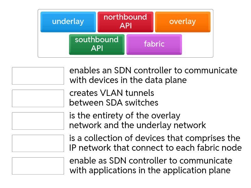 overlay - creates VLAN tunnels between SDA switches, underlay - is a collection of devices that comprises the IP network that connect to each fabric node, northbound API - enable as SDN controller to communicate with applications in the application plane, fabric - is the entirety of the overlay network and the underlay network, southbound API - enables an SDN controller to communicate with devices in the data plane,