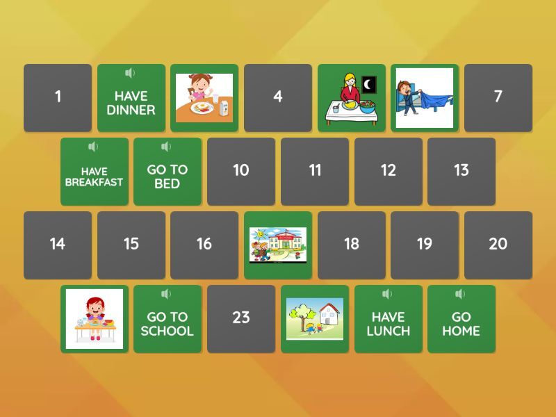 GO TO BED, GO TO SCHOOL, GO HOME, HAVE BREAKFAST, HAVE LUNCH, HAVE DINNER, GET DRESSED, WASH MY FACE, COMB MY HAIR, TAKE A SHOWER, PLAY WITH FRIENDS, DO MY HOMEWORK, GET UP,