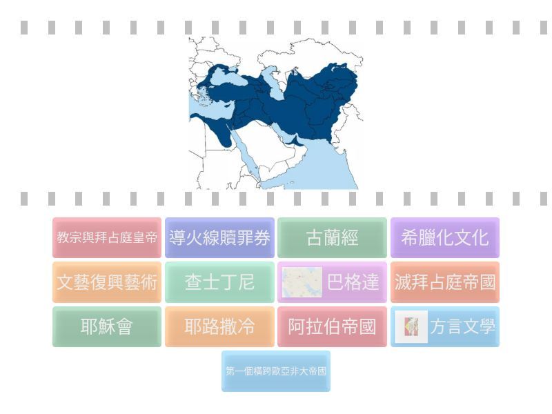 第一個橫跨歐亞非大帝國, 阿拉伯帝國, 耶路撒冷 - 猶太教、基督教、伊斯蘭教聖地, 古蘭經 - 阿拉伯文廣傳至伊斯蘭教世界, 巴格達 - 阿拔斯王朝(750A.D.~1258A.D.)的政經、宗教文化中心。, 導火線贖罪券 - 馬丁路德宗教改革, 查士丁尼 - 聖索菲亞大教堂, 滅拜占庭帝國, 希臘化文化, 方言文學 - 文藝復興文學成就, 教宗與拜占庭皇帝 - 基督教分裂為東正教與羅馬公教, 文藝復興藝術 - 米開朗基羅, 耶穌會 - 羅馬公教內部的改革,
