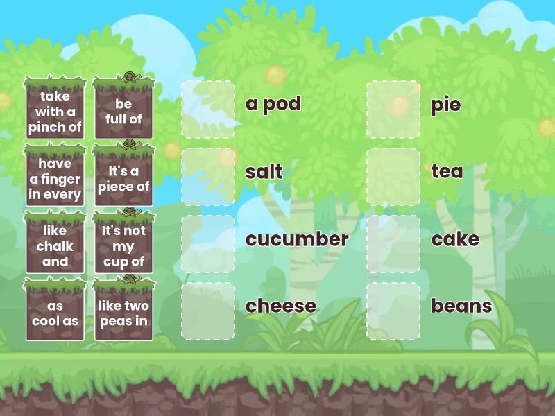 as cool as - cucumber, like two peas in - a pod, like chalk and - cheese, It's not my cup of - tea, take with a pinch of - salt, have a finger in every - pie, be full of - beans, It's a piece of - cake,