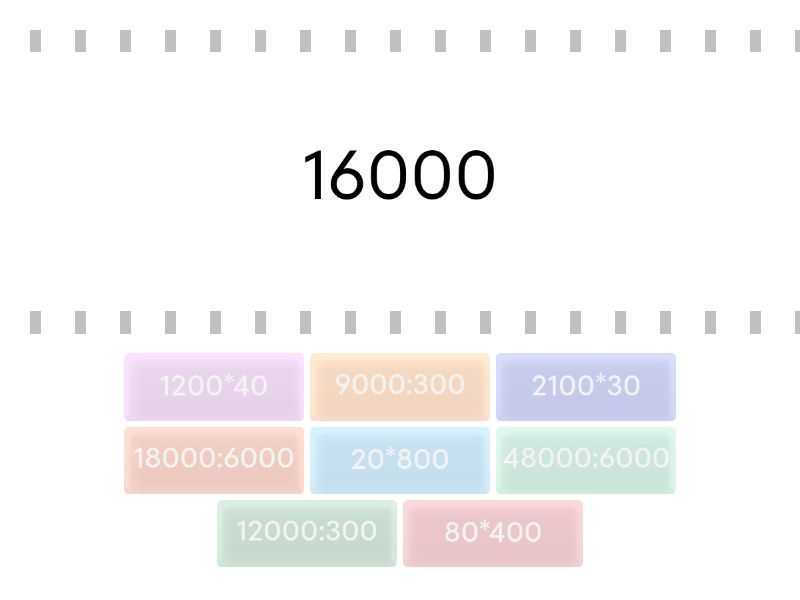 20*800 - 16000, 80*400 - 32000, 9000:300 - 30, 12000:300 - 40, 1200*40 - 48000, 2100*30 - 63000, 48000:6000 - 8, 18000:6000 - 3,