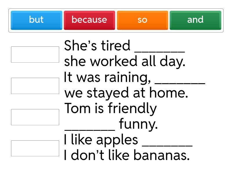 but - I like apples _______ I don’t like bananas., because - She’s tired _______ she worked all day., so - It was raining, _______ we stayed at home., and - Tom is friendly _______ funny.,