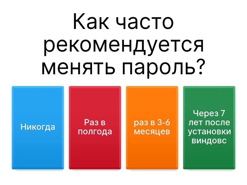 1) Как часто рекомендуется менять пароль? a) Никогда b) Раз в полгода c) раз в 3-6 месяцев d) Через 7 лет после установки виндовс 2) Что нельзя делать в обществественнойй WiFi сети a) смотреть видео b) входить в интернет банк c) читать новости d) искать музыку 3) Как распознать придельный сайт? a) У него странный адрес и ошибка в названии b) много рекламы c) он долго грузит d) он красивый 4) Что нужно делать если ПК заражён вирусом? a) проверить систему и удалить угрозу b) ничего c) сменить обои d) удалисть антивирус 5) кто такой хакер? a) человек взламывающий ПК и данные b) добрый человек  c) злой дядя d) посогает вам скачать Винду и починить ПК