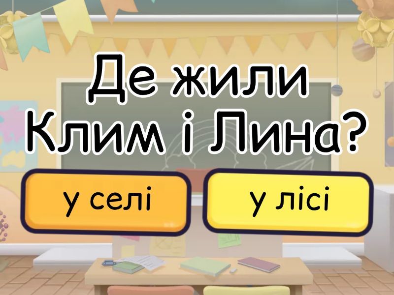 1) Де жили Клим і Лина? a) у селі b) у лісі 2) Що вирішили зробити батьки на згадку про народження донечки? a) влаштувати свято b) переселитися в ліс c) посадити деревце d) посадити картоплю 3) Яке ім’я дали батьки дівчинці? a) Карина b) Марина c) Калина d) Христина 4) Яке дерево садять батьки на згадку про народження сина? a) дуб b) ялину c) клен d) вербу