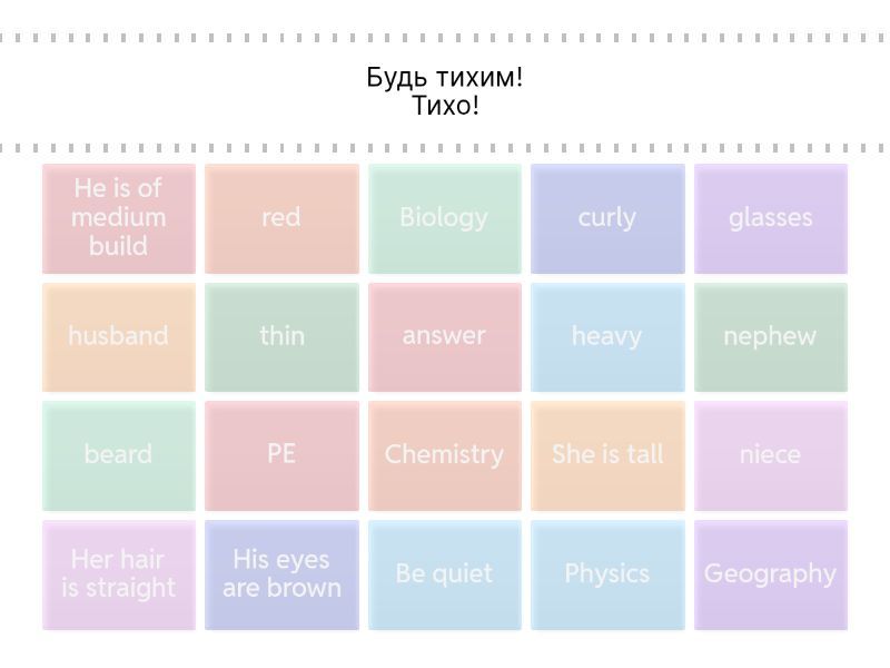 Be quiet - Будь тихим! Тихо!, answer - ответ, husband - муж, nephew - племянник, niece - племянница, curly - кудрявый, beard - борода, red - рыжий, glasses - очки, heavy - тяжелый, He is of medium build - Он среднего телосложения, She is tall - Она высокая, thin - худенький, Her hair is straight - Её волосы прямые, His eyes are brown - Его глаза карие, Biology - биология, Chemistry - химия, Geography - география, Physics - физика, PE - физкультура,
