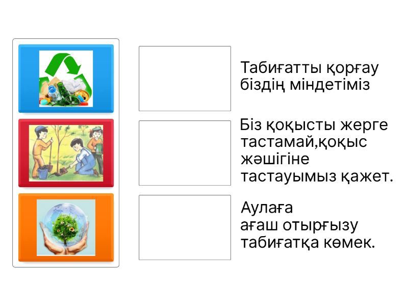 Аулаға ағаш отырғызу табиғатқа көмек., Біз қоқысты жерге тастамай,қоқыс жәшігіне тастауымыз қажет., Табиғатты қорғау біздің міндетіміз,