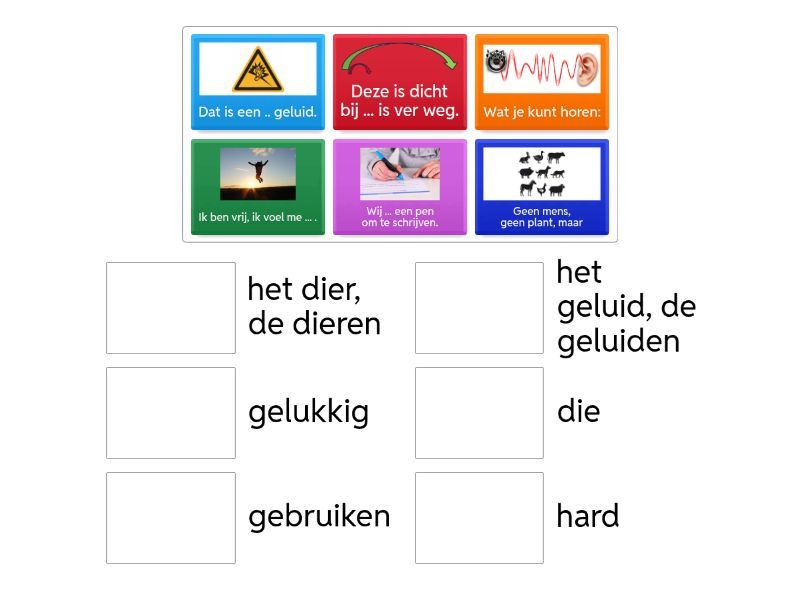Je hebt me goed geholpen, grote ... - dank, Deze is dicht bij ... is ver weg. - die, Geen mens, geen plant, maar - het dier, de dieren, Geen mens, geen plant, geen dier, maar… - het ding, de dingen, De tunnel gaat ... de berg. - door, Niet nep! ... waar! - echt, ... weekend! - fijn, prettig, Wij ... een pen om te schrijven. - gebruiken, Dat is een .. geluid. - hard, Wat je kunt horen: - het geluid, de geluiden, Ik ben vrij, ik voel me ... . - gelukkig, Het ... is half voor het raam. - het gordijn, de gordijnen,