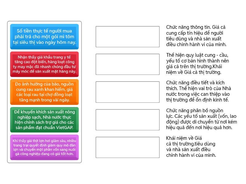 Khi thấy giá thịt lợn hơi giảm sâu, nhiều trang trại quyết định giảm quy mô đàn lợn và chuyển một phần vốn sang nuôi gà công nghiệp đang có giá tốt hơn. - Chức năng phân bổ nguồn lực. Các yếu tố sản xuất (vốn, lao động) được di chuyển từ nơi kém hiệu quả đến nơi hiệu quả hơn., Số tiền thực tế người mua phải trả cho một gói mì tôm tại siêu thị vào ngày hôm nay. - Khái niệm về Giá cả thị trường.tiêu dùng và nhà sản xuất điều chỉnh hành vi của mình., Do ảnh hưởng của bão, nguồn cung rau xanh khan hiếm, giá các loại rau tại chợ đồng loạt tăng mạnh trong vài ngày. - Thể hiện quy luật cung - cầu, yếu tố cơ bản hình thành nên giá cả trên thị trường.Khái niệm về Giá cả thị trường., Nhận thấy giá khẩu trang y tế tăng cao đột biến, hàng loạt công ty may mặc đã nhanh chóng đầu tư máy móc để sản xuất mặt hàng này. - Chức năng thông tin. Giá cả cung cấp tín hiệu để người tiêu dùng và nhà sản xuất điều chỉnh hành vi của mình., Để khuyến khích sản xuất nông nghiệp sạch, Nhà nước thực hiện chính sách trợ giá cho các sản phẩm đạt chuẩn VietGAP. - Chức năng điều tiết và kích thích. Thể hiện vai trò của Nhà nước trong việc can thiệp vào thị trường để ổn định kinh tế.,