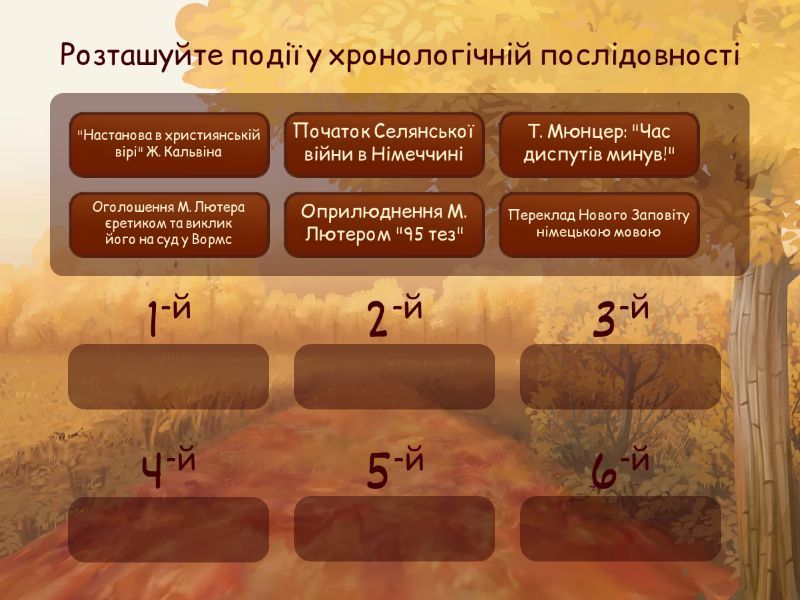 Оприлюднення М. Лютером "95 тез", Оголошення М. Лютера єретиком та виклик його на суд у Вормс, Переклад Нового Заповіту німецькою мовою, Т. Мюнцер: "Час диспутів минув!", Початок Селянської війни в Німеччині, "Настанова в християнській вірі" Ж. Кальвіна.
