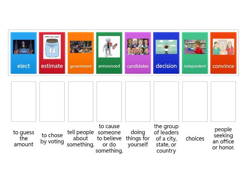 announced - tell people about something., candidates - people seeking an office or honor., convince - to cause someone to believe or do something., decision - choices, elect - to chose by voting, estimate - to guess the amount, government - the group of leaders of a city, state, or country, independent - doing things for yourself ,