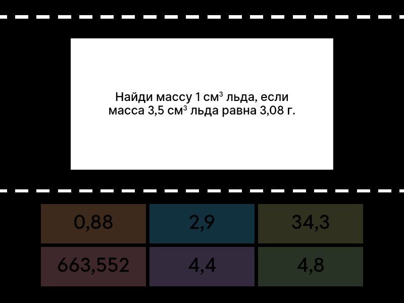 0,88 - Найди массу 1 см3 льда, если масса 3,5 см3 льда равна 3,08 г., 4,8 - За 2,4 ч мальчик прошёл 7,2 км. Сколько километров он пройдёт с той же скоростью за 1,6 ч?, 2,9 - Питательный раствор для подкормки растений поступает в теплицу по двум трубам. Первая была открыта 0,6ч, а вторая 0,4ч. В результате поступило 3,32л раствора. Сколько питательного раствора подаётся за 1ч по второй трубе, если по первой поступает 3,6л раствора за 1ч?, 34,3 - Собственная скорость лодки 8,5 км/ч, а скорость течения 1,3 км/ч. Какое расстояние пройдёт лодка по течению за 3,5 ч?, 663,552 - Ширина прямоугольного параллелепипеда 7,2 см, что составляет ¾ длины и ¾ высоты. Найди объём этого параллелепипеда., 4,4 - Путь от дома до школы равен 1,1 км. Девочка проходит этот путь за 0,25 ч. С какой скоростью идёт девочка?,