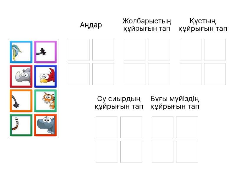 Аңдар: , , , , Жолбарыстың құйрығын тап: , Құстың құйрығын тап: , Су сиырдың құйрығын тап: , Бұғы мүйіздің құйрығын тап: ,