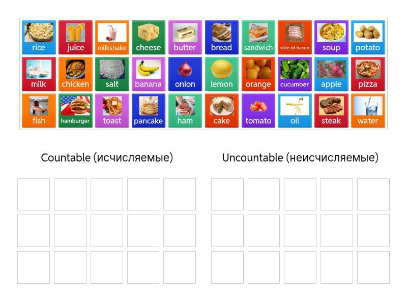 Countable (исчисляемые): steak, slice of bacon, potato, banana, apple, orange, pizza, hamburger, sandwich, cake, pancake, tomato, onion, cucumber, lemon, Uncountable (неисчисляемые): ham, chicken, rice, butter, cheese, milk, water, juice, milkshake, oil, salt, bread, soup, toast, fish,