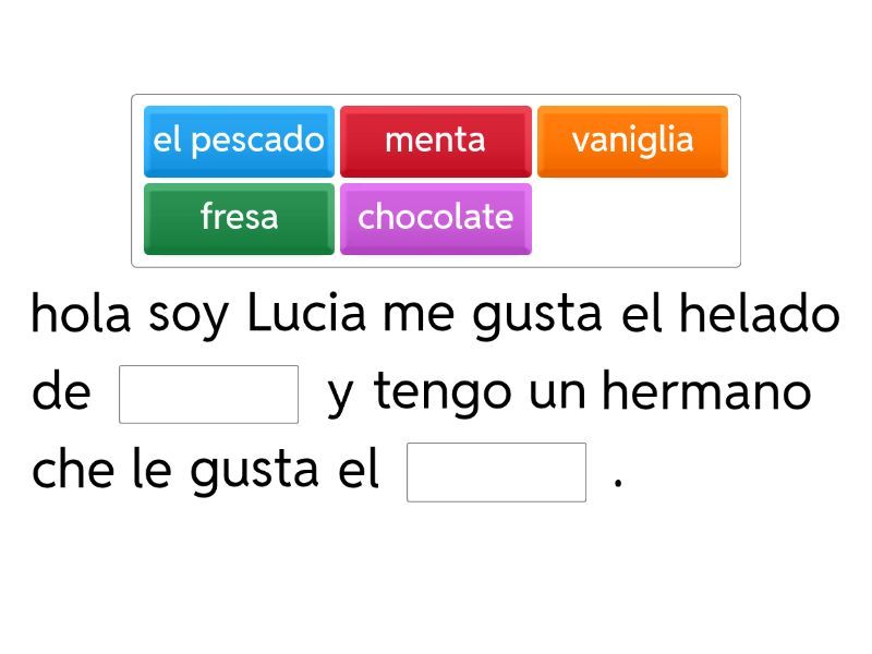 hola soy Lucia me gusta el helado de ____ y tengo un hermano che le gusta el ____ . hola soy Marco hablo :el español , l'italiano y ____ mi mami es de ____ y mi papa es de ____ . Hola soy Leo ____ ____ travieso , me gusta ____ y mi mejor amigo es Marco .