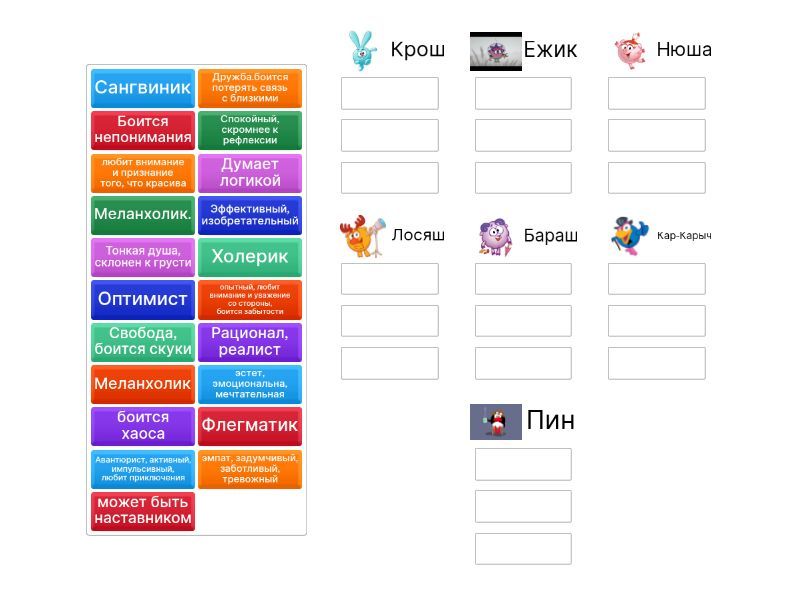Крош: Холерик, Авантюрист, активный, импульсивный, любит приключения, Свобода, боится скуки, Ежик: Меланхолик, эмпат, задумчивый, заботливый, тревожный, Дружба.боится потерять связь с близкими , Нюша: Сангвиник, эстет, эмоциональна, мечтательная, любит внимание и признание того, что красива , Лосяш : Флегматик, Спокойный, скромнее к рефлексии, боится хаоса , Бараш: Меланхолик., Тонкая душа, склонен к грусти , Боится непонимания, Кар-Карыч: Оптимист , может быть наставником, опытный, любит внимание и уважение со стороны, боится забытости, Пин: Рационал, реалист , Думает логикой, Эффективный, изобретательный,