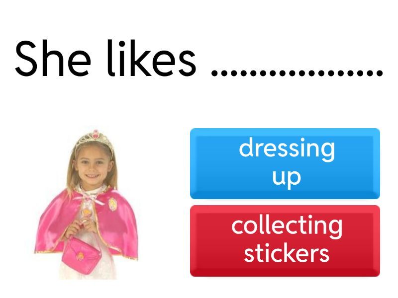 1) She likes .................. a) dressinɡ up b) collectinɡ stickers 2) We don't like ............... a) bɑkinɡ b) playinɡ hide and seek 3) My mother doesn't like ............ a) roller-skɑtinɡ b) wɑtchinɡ films 4) I don't like ................... a) doinɡ puzzles b) reading comic books