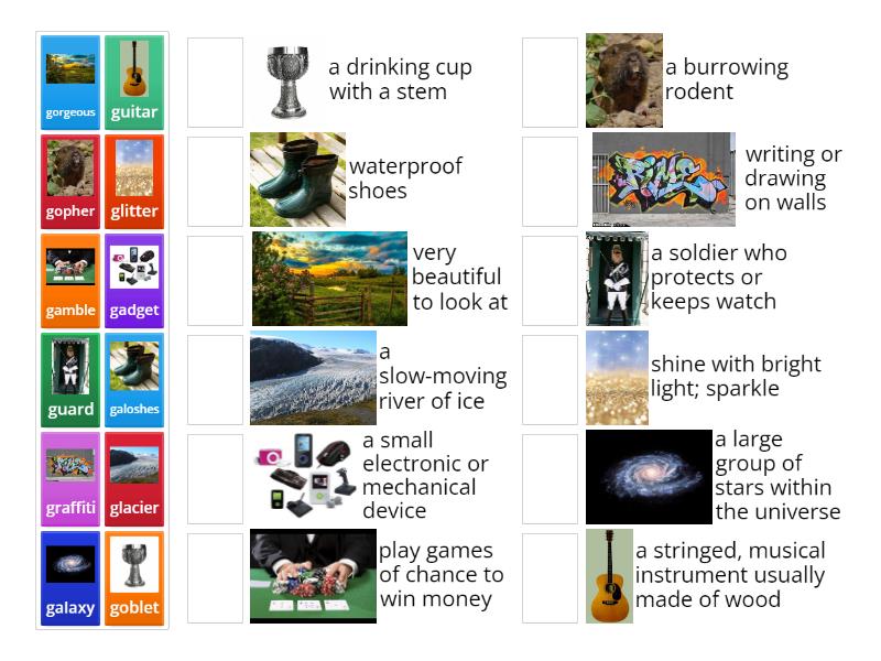 gadget - a small electronic or mechanical device, galaxy - a large group of stars within the universe, galoshes - waterproof shoes, gamble - play games of chance to win money, glacier - a slow-moving river of ice, gopher - a burrowing rodent, graffiti - writing or drawing on walls, guard - a soldier who protects or keeps watch, guitar - a stringed, musical instrument usually made of wood, gorgeous - very beautiful to look at, goblet - a drinking cup with a stem, glitter - shine with bright light; sparkle,