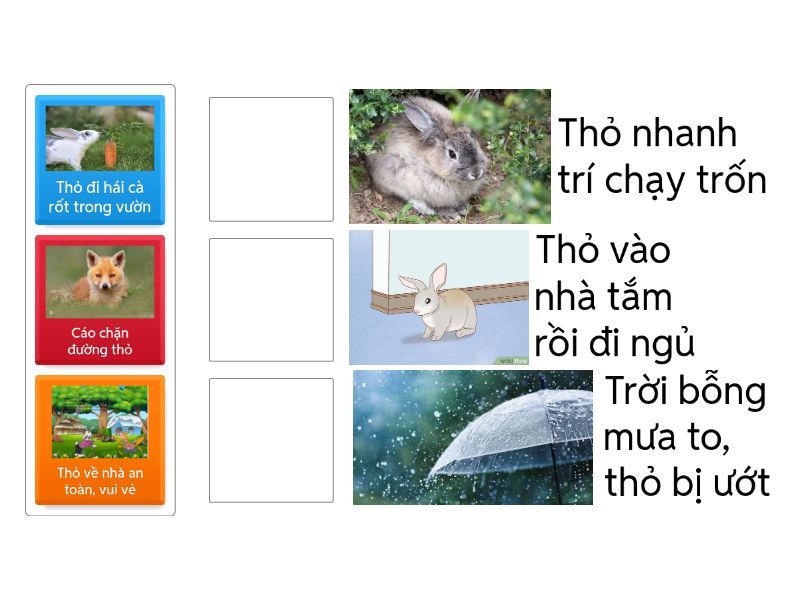Thỏ đi hái cà rốt trong vườn - Trời bỗng mưa to, thỏ bị ướt, Cáo chặn đường thỏ - Thỏ nhanh trí chạy trốn, Thỏ về nhà an toàn, vui vẻ - Thỏ vào nhà tắm rồi đi ngủ,