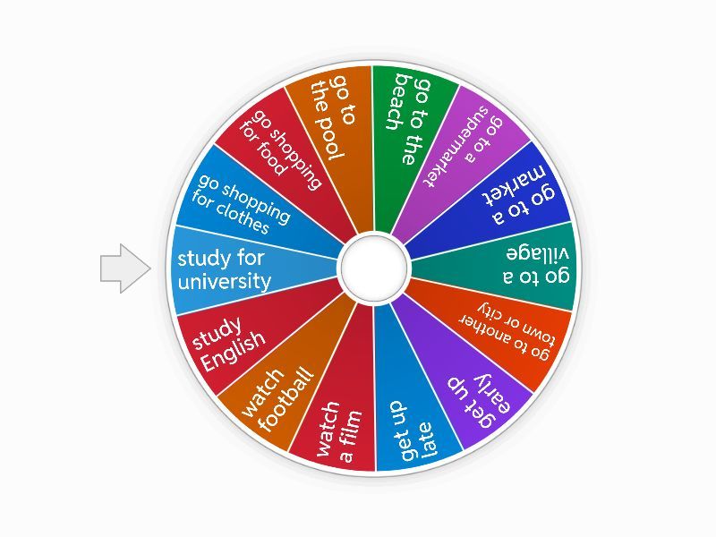 1) go shopping for clothes 2) go shopping for food 3) go to the pool 4) go to the beach 5) go to a supermarket 6) go to a market 7) go to a village 8) go to another town or city 9) get up early 10) get up late 11) watch a film 12) watch football 13) study English 14) study for university