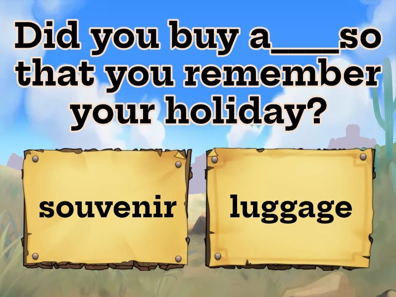 1) Did you buy a____so that you remember your holiday? a) souvenir b) luggage 2) I'm _____today - I want to visit the main square and the museum a) go sightseeing b) going sightseeing c) go on a trip 3) We_____this holiday at the _______last week a) went on a trip, book b) booked, travel agency c) go on a trip, package holiday 4) Would you like to _______to Paris with me? a) package holiday b) go on a trip c) travel agency 5) Have the got a lot of_____? My car is quite small a) luggage b) package holiday 6) She decided to go on a ______where the company organised everything for her a) package holiday b) travel agency c) go sightseeing