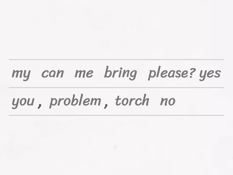 can you bring me my torch, please? yes, no problem, can I have the map? not now, sorry. I'm using it right now, could you give me the train timetable? yes, of course, can you give me a pen? sorry, I can't. I have only one, could you bring me my trainers? yes, no problem. here you are,