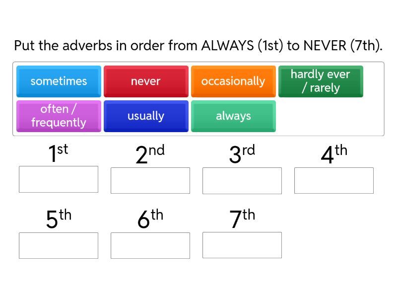 always, usually, often / frequently, sometimes, occasionally, hardly ever / rarely, never.