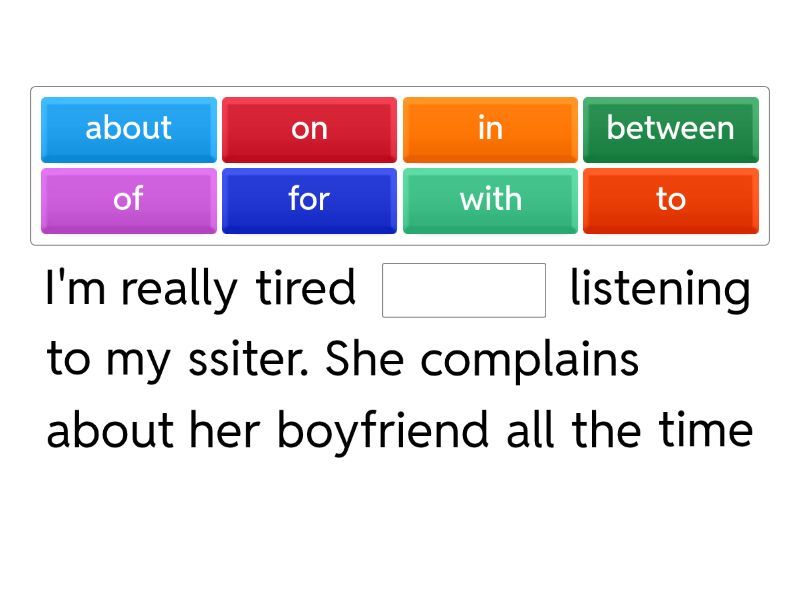 I'm really tired ____ listening to my ssiter. She complains about her boyfriend all the time Katy's worried ____ her end-of-year exams. She thinks she's going to fail The waiter was so rude ____ us that we didn't leave a tip They're not very pleased ____ their new car. It's broken down three times in one month! My mum's been married ____ my stepfather for 20 years Tom's interested ____ joining the army because he wants to see the world Are you excited ____ moving house next year? That man over there reminds me ____ my first boyfriend Are you looking forward ____ meeting him? I'd like to go with you on holiday, but it depends ____ how much it will cost Recent research shows that drinking mango juice is good ____ your immune system You'll have to choose ____ this one and that one. You can't have both My sister and I get on really well and hardly ever argue ____ anything I apologized ____ the teacher ____ being late Who does this book belong ____? Is it yours, Sarah? What time does your plane arrive ____ Brussels? Is Carl still angry ____ Monica ____ what happened at the party? You should be kinder ____ your brother I never have to ask anybody ____ directions any more, now that I have a satnav He's the first person in his family to go to university, so his parents are really proud ____ him