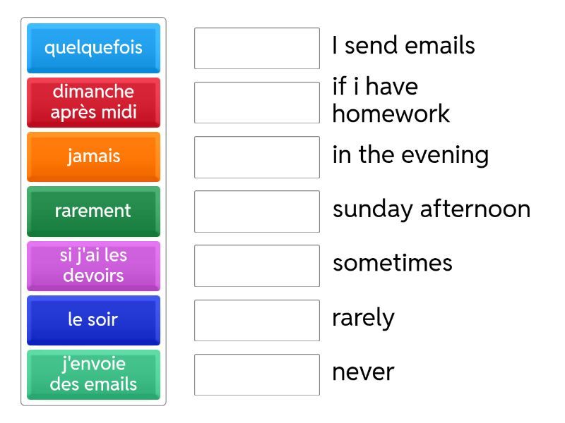 deux fois par semaine - twice a week, je parle avec mes amis - I talk with my friends, j'envoie des emails - I send emails, souvent - often, le soir - in the evening, le weekend - at the weekend, samedi matin - saturday morning, dimanche après midi - sunday afternoon, quand je peux - when I can, si j'ai les devoirs - if i have homework, quelquefois - sometimes, quand il faut - when it's necessary, jamais - never, rarement - rarely,