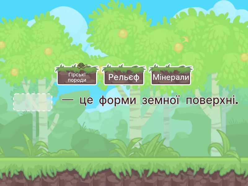 ____ — це форми земної поверхні. Деякі елементи рельєфу формуються відносно швидко внаслідок руху ____ (наприклад, гори). А інші елементи рельєфу утворються протягом тривалого часу внаслідок ____ (каньйони, яри, долини). Ерозія — це ____ , зміна форм рельєфу під дією вітру, потоків води, льодовиків.