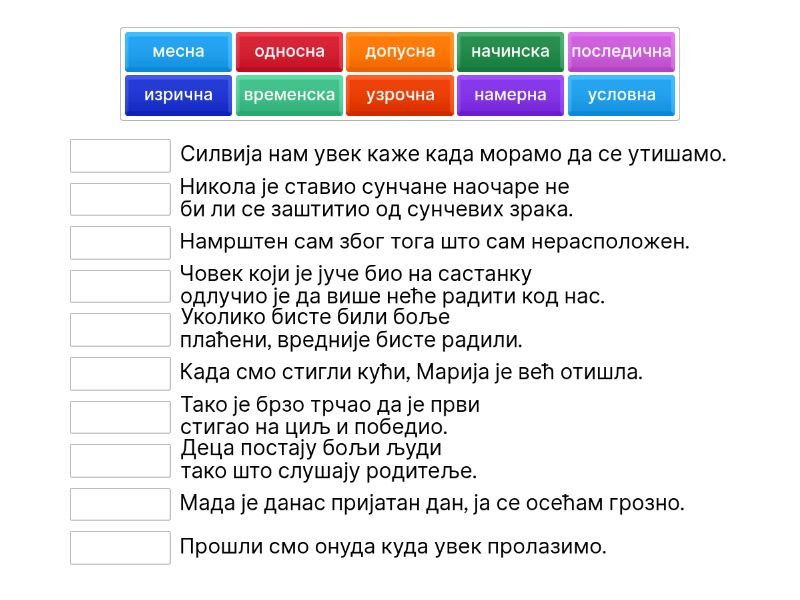 временска - Када смо стигли кући, Марија је већ отишла., узрочна - Намрштен сам због тога што сам нерасположен., изрична - Силвија нам увек каже када морамо да се утишамо., последична - Тако је брзо трчао да је први стигао на циљ и победио., намерна - Никола је ставио сунчане наочаре не би ли се заштитио од сунчевих зрака., допусна - Мада је данас пријатан дан, ја се осећам грозно., месна - Прошли смо онуда куда увек пролазимо., условна - Уколико бисте били боље плаћени, вредније бисте радили., начинска - Деца постају бољи људи тако што слушају родитеље., односна - Човек који је јуче био на састанку одлучио је да више неће радити код нас.,