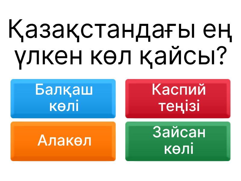 1) Қазақстандағы ең үлкен көл қайсы? a) Балқаш көлі b) Каспий теңізі c) Алакөл d) Зайсан көлі 2) Балқаш көлі несімен ерекше? a) Суы тұзды b) Суы өте терең c) Бір бөлігі тұщы, бір бөлігі ащы d) Онда балық жоқ 3) Арал теңізі не себепті кішірейіп бара жатыр? a) Жаңбыр аз жауатындықтан b) Өзен сулары егістікке пайдаланылғандықтан c) Климат өзгергендіктен d) Көлге су құйылмайтындықтан 4) Ең биік таулы көл қалай аталады? a) Алакөл b) Зайсан c) Үлкен Алматы көлі d) Шалқар көлі 5) Қазақстанда шамамен қанша көл бар? a) 10 мыңнан астам b) 20 мыңнан астам c) 48 мыңнан астам d) 100 мыңнан астам