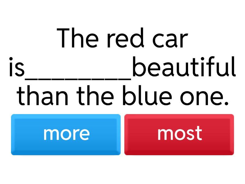 1) The red car is________beautiful than the blue one. a) more b) most 2) My bag is ________ (light) than yours. a) more light b) lighter 3) Today is ________ (sunny) than yesterday. a) sunnier b) more sunny 4) This book is ________ (interesting) than the movie. a) interestingier b) more interesting 5) My house is ________ (comfortable) than your flat. a) more comfortable b) comfortabler 6) This laptop is ________ (expensive) as that one. a) as expensive as b) more expensive as 7) Today's weather is________than yesterday's. a) gooder b) better 8) The Maths test is ________than the English test. a) more difficult b) difficulter