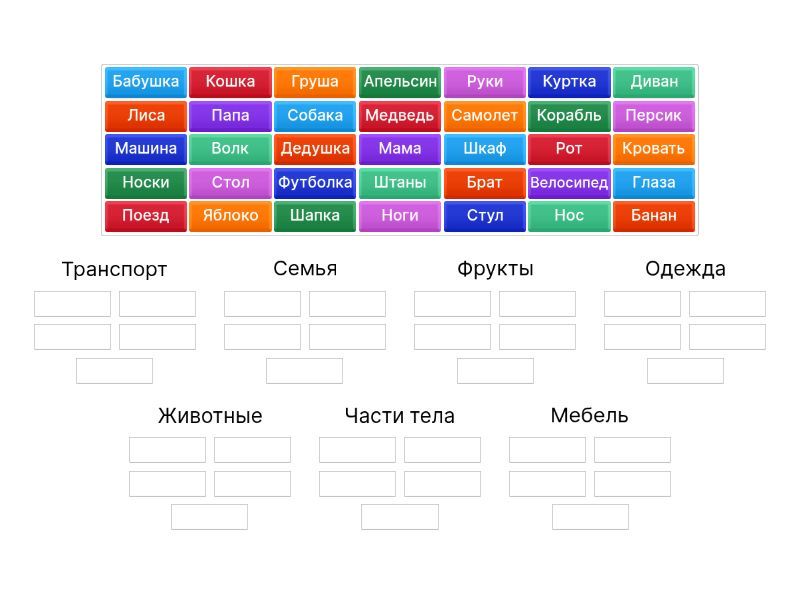 Транспорт: Машина, Корабль, Поезд, Самолет, Велосипед , Семья : Мама, Папа, Бабушка, Брат, Дедушка, Фрукты: Груша, Яблоко , Банан, Апельсин, Персик, Одежда : Футболка, Штаны , Носки, Куртка, Шапка, Животные: Кошка, Собака, Лиса, Волк, Медведь , Части тела: Глаза, Рот, Нос, Руки, Ноги, Мебель: Кровать, Шкаф, Стол , Стул, Диван,