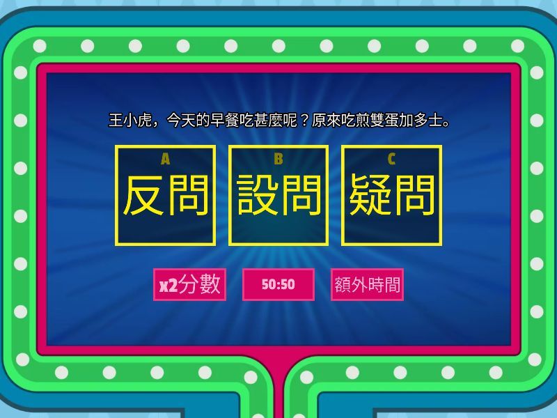 1) 王小虎,今天的早餐吃甚麼呢?原來吃煎雙蛋加多士。 a) 反問 b) 設問 c) 疑問 2) 陳媽媽對你照顧得無微不至,難道你感受不到嗎? a) 反問 b) 設問 c) 疑問 3) 王阿花,你為什麼經常去廁所呢? a) 反問 b) 設問 c) 疑問 4) 閲讀書籍有甚麼好處呢?我認為可以增廣見聞。 a) 反問 b) 設問 c) 疑問 5) 你怎能把重要的工作交給粗心大意的王小虎呢? a) 反問 b) 設問 c) 疑問 6) 你最喜歡的運動是甚麼?我最喜歡的運動是打羽毛球。 a) 反問 b) 設問 c) 疑問 7) 你怎麼會不認識彭校長? a) 反問 b) 設問 c) 疑問 8) 這個蛋糕是誰做的?是你嗎? a) 反問 b) 設問 c) 疑問 9) 這次是千載難逢的機會,李老師怎會錯過? a) 反問 b) 設問 c) 疑問 10) 你對這項安排有甚麼意見? a) 反問 b) 設問 c) 疑問 11) 當欣穎遇到困難,王小虎怎會袖手旁觀呢?他們是好朋友呢! a) 反問 b) 設問 c) 疑問 12) 李老師問:「你們聽過『望梅止渴』這個成語故事嗎?」 a) 反問 b) 設問 c) 疑問 13) 你的晚禮服十分漂亮,不知道是誰設計的? a) 反問 b) 設問 c) 疑問 14) 八時了,弟弟還不起床? a) 反問 b) 設問 c) 疑問 15) 今天有體育課,阿花怎麼不記得了? a) 反問 b) 設問 c) 疑問