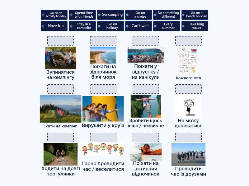 Go on holiday - Поїхати у відпустку / на канікули, Go camping - Їхати на кемпінг, Go on a beach holiday - Поїхати на відпочинок біля моря, Stay in a campsite - Зупинятися на кемпінгу, Take long walks - Ходити на довгі прогулянки, Do something different - Зробити щось інше / незвичне, Go on a cruise - Вирушити у круїз, Go on an activity holiday - Поїхати на активний відпочинок, Spend time with friends - Проводити час із друзями, Can’t wait - Не можу дочекатися, Every summer - Кожного літа, Have fun - Гарно проводити час / веселитися,