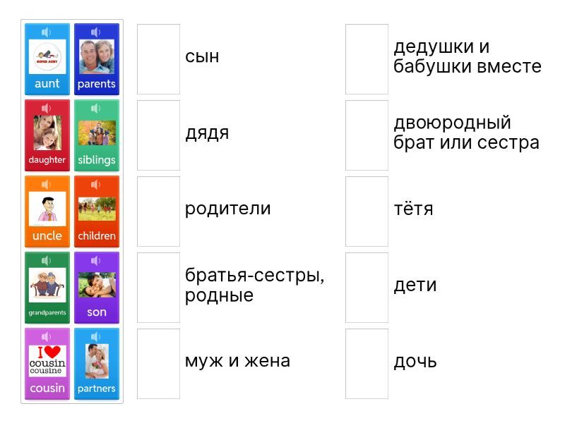 parents - родители, son - сын, daughter - дочь, aunt - тётя, uncle - дядя, cousin - двоюродный брат или сестра, children - дети, siblings - братья-сестры, родные, grandparents - дедушки и бабушки вместе, partners - муж и жена,