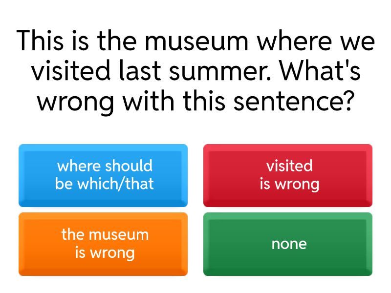 1) This is the museum where we visited last summer. What's wrong with this sentence? a) where should be which/that b) visited is wrong c) the museum is wrong d) none