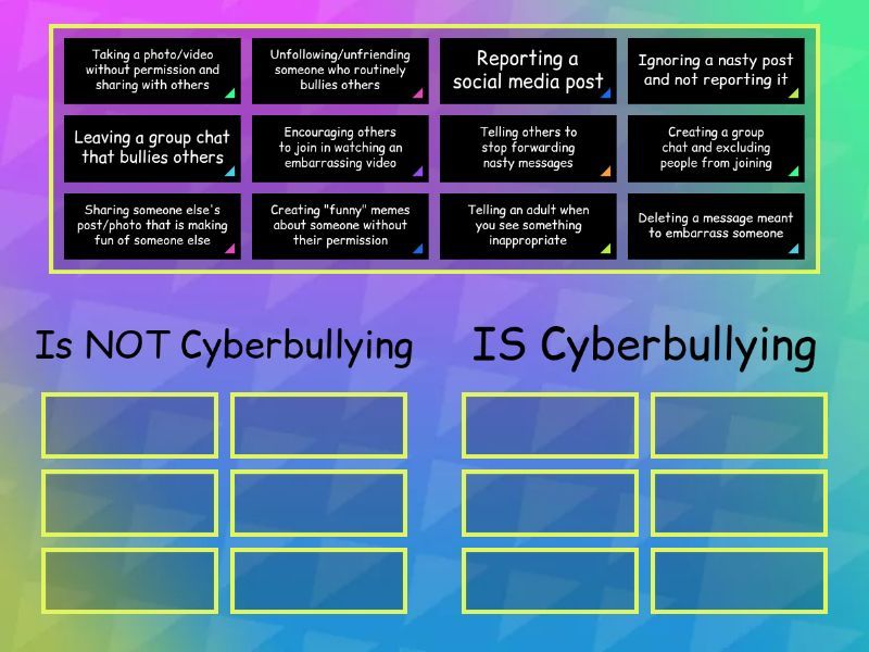 Is NOT Cyberbullying: Telling an adult when you see something inappropriate, Deleting a message meant to embarrass someone, Telling others to stop forwarding nasty messages, Reporting a social media post, Unfollowing/unfriending someone who routinely bullies others, Leaving a group chat that bullies others, IS Cyberbullying: Taking a photo/video without permission and sharing with others, Sharing someone else's post/photo that is making fun of someone else, Creating a group chat and excluding people from joining, Ignoring a nasty post and not reporting it, Encouraging others to join in watching an embarrassing video, Creating "funny" memes about someone without their permission,