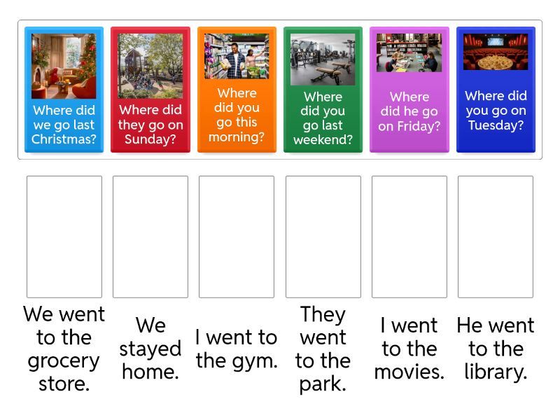 Where did you go on Tuesday? - I went to the movies., Where did you go last weekend? - I went to the gym., Where did you go this morning? - We went to the grocery store., Where did he go on Friday? - He went to the library., Where did they go on Sunday? - They went to the park., Where did we go last Christmas? - We stayed home.,