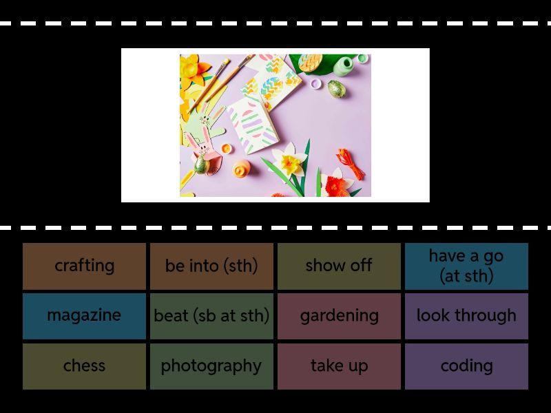 crafting, photography, magazine, chess, gardening , coding, be into (sth) - like (=μου αρέσει), beat (sb at sth) - νικάω/κερδίζω (κάποιον σε κάτι), have a go (at sth) - try (=δοκιμάζω κάτι), show off - κάνω "φιγούρα", επιδεικνύω, take up - ξεκινάω (ένα χόμπυ), look through - ρίχνω μια ματιά, ξεφυλλίζω,