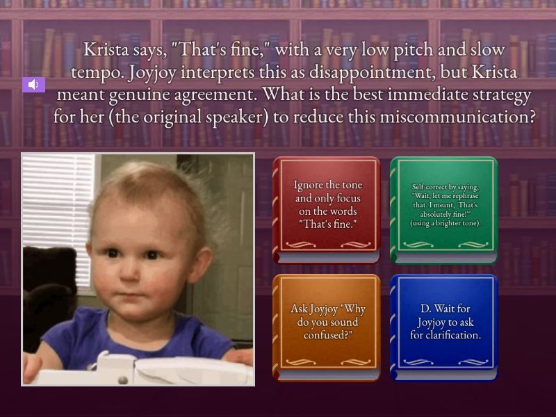 1) Krista says, "That's fine," with a very low pitch and slow tempo. Joyjoy interprets this as disappointment, but Krista meant genuine agreement. What is the best immediate strategy for her (the original speaker) to reduce this miscommunication? a) Ignore the tone and only focus on the words "That's fine." b) Self-correct by saying, "Wait, let me rephrase that. I meant, 'That's absolutely fine!'" (using a brighter tone). c) Ask Joyjoy "Why do you sound confused?" d) D. Wait for Joyjoy to ask for clarification. 2) During a negotiation, Mr. Gomez notices Ms. Cruz’ volume suddenly increased on the word "never," making the statement sound overly aggressive, even though Cruz was just trying to be firm. What is the best strategy to reduce the perceived aggression without backing down? a) Politely interrupt and say, "I sense a strong feeling in your voice on that word. Can we revisit the premise without that emphasis?" b) Match Ms. Cruz's volume to show you are equally firm. c) Stop talking until Cruz physically calms down. d) Immediately concede the point to avoid conflict. 3) Isa is telling an important story, but her tempo is too rapid, causing her listeners to miss a crucial detail. What is the best strategy for Isa to employ immediately to improve clarity? a) Ask, "Are you not paying attention?" b) Speed up even more to get to the end of the story quickly. c) Reduce the tempo, insert a strategic pause before the next key piece of information, and use slightly clearer articulation. d) Re-tell the entire story from the beginning, word for word. 4) You said "Yes" with a rising inflection (like a question), but you meant a definite, closed answer ("Yes, I agree"). The listener starts to respond as if they need to convince you. What is the best self-correction strategy to confirm your attitude? a) Stop the listener and say, "Hold on, I wasn't asking a question." b) Repeat the word "Yes" using a falling terminal contour and a firmer, slightly louder volume. c) Immediately give five reasons why you agree. d) Ask the listener what they thought you meant. 5) A colleague consistently uses a sarcastic upward lilt on phrases that are meant to be neutral (e.g., "Great idea"). This creates confusion about their true opinion. What is the best proactive strategy for you to reduce this pattern in future interactions? a) Publicly call out their sarcasm every time it happens. b) When they use the tone, calmly state, "When you use that tone on that phrase, it sounds like sarcasm, but I know you mean X. Could you rephrase it with a flatter tone so I can be sure?" c) Only communicate with them via email from now on. d) Lower your own volume every time they use the lilt to signal disapproval. 6) Your friend is telling you about a stressful family situation. They are speaking very quickly, and their pitch is unusually high. To show you are actively listening and building rapport, which strategy should you employ? a) Use Emphasis to Highlight Key Points by speaking louder than them. b) Match Emotional Tone by carefully mirroring their rising pitch slightly to show empathy. c) Avoid Monotone by keeping your voice steady and low to calm them down immediately. d) None of the above 7) Kamila need to explain the concept of Entropy(S) in Physics to her study group. She wants to make sure the most critical part, measuring disorder, sticks in their memory. Which strategy is best suited for ensuring the most important part of her message is retained? a) Use Pauses strategically to allow listeners to process the complex equations. b) Use Emphasis by changing your Volume and Pace when saying "disorder." c) Control Your Tone of Voice by ensuring you sound completely neutral and objective. d) All of the above 8) Group 4 is trying to explain their viewpoint on a historical event, but they keep hesitating and using weak language. You want to encourage them to share their full thoughts without criticizing their current delivery. Which approach aligns with the guidance on checking understanding? a) Use a Reassuring Tone to show you are there to help them clarify, not criticize. b) Avoid Sarcasm, as it can easily be misinterpreted. c) Match Emotional Tone by adopting a slightly doubtful tone to prompt them to be more certain. d) None of the above 9) Niña is feeling frustrated because her group keeps ignoring her suggestions. Before she speaks, she takes a deep breath and consciously decide to speak slowly and evenly, even though she feels angry. Which specific strategy is she applying to manage her emotions while speaking? a) Acknowledge Emotions with Your Voice by validating your own frustration first. b) Control Your Tone of Voice by avoiding an angry or condescending tone, aiming for calm. c) Be Respectful by ensuring your volume is lower than everyone else's d) All of the above 10) You need to disagree with a suggestion made by the group leader, but you want to maintain a good working relationship. Which strategy should guide your delivery to ensure your disagreement is heard professionally? a) Avoid Monotone by making your voice sound very energetic to mask the disagreement. b) Use a Respectful Tone, even when disagreeing, to maintain courtesy. c) Check for Uncertainties by summarizing their point back to them using a question mark inflection. d) All of the above